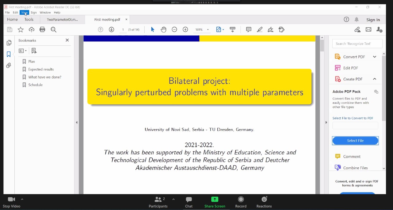 Our objective 2 is: • to numerical analyze and solve first order reaction-diffusion system, • to numerical analyze and solve first order convection-diffusion system, • to investigate stabilization methods for this application. It is one aim of the project to combine the know-how of the two research groups. The research group in Novi Sad has certain experience in studying two-parameter SPP while the group in Dresden has extensive experience in analyzing one-parameter singularly perturbed problems and simulating them numerically. Mutual exchange of knowledge and experiences will contribute to a faster and more successful solution of the set problems. The experienced participants will monitor the scientific work and help in modeling, analysis and computation. Study visits and exchange of personnel will produce more rapid flow of information, open some up-to-date research subjects and put the level of research standards (specially for young researchers) higher than the local ones. As communication is extremely important part of scientific work, the possibilities for results of highest quality will be increased.