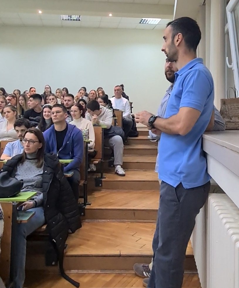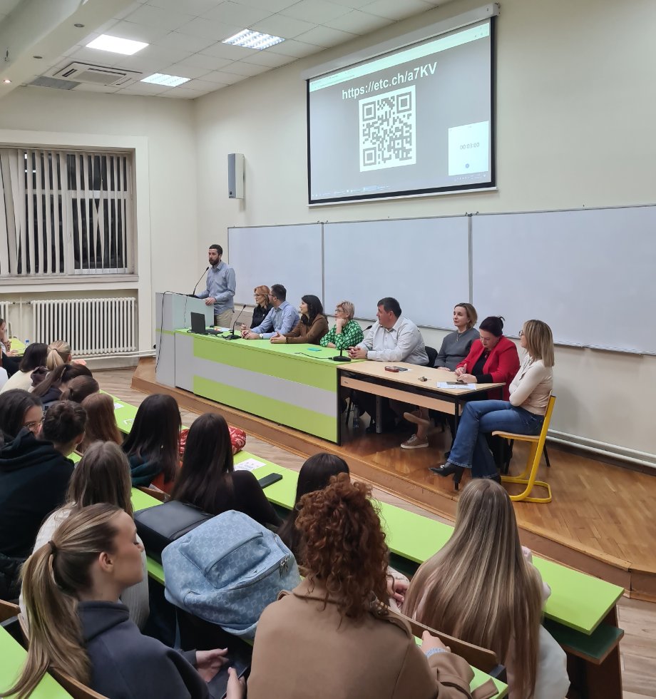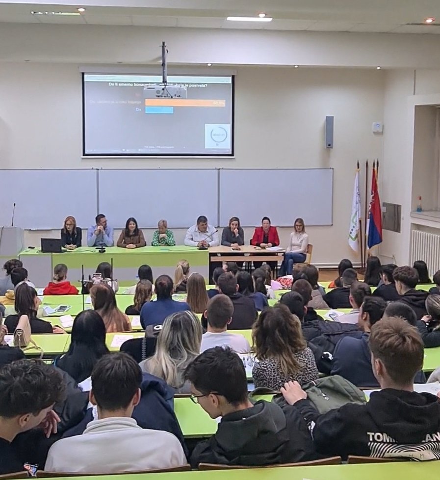 Тема трибине је привукла интересовање великог броја ученика средњих школа из Новог Сада и околине, који су, заједно са наставницима, испунили амфитеатар Факултета.