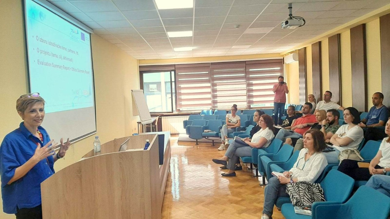 Др Наташа Ђуришић - Младеновић, координатор TwiNSolCECs пројекта представила је фазе у припреми овог пројекта, који је освојио 14,5 од максималних 15 поена у оквиру позива Twinning Western Balkans из 2021, а након тога је продеканица за науку, др Зита Шереш пренела најновије информације у вези новоотворених Twinning позива.